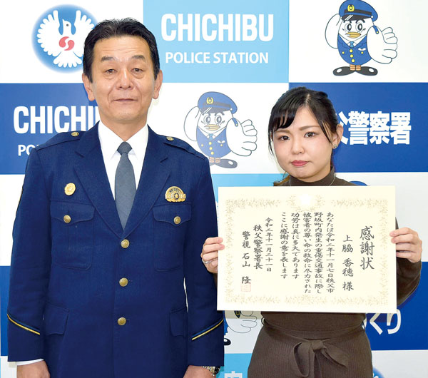 とっさに体動いた…交通事故に遭遇した理学療法士、意識不明の女性に心臓マッサージ 秩父署が感謝状