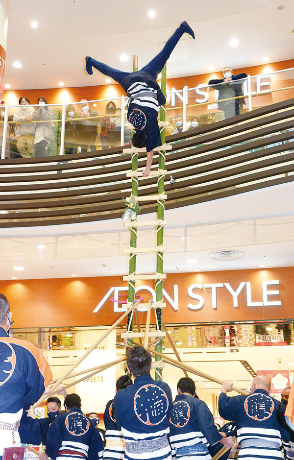 越谷のイオンで出初式 スリル満点、江戸時代から続く伝統の技を披露 新春の風物詩、観客から大きな拍手