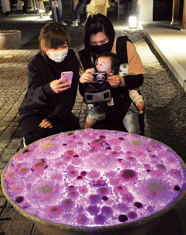 花浮かべた鉢の底からライトアップ 埼玉・行田で花手水ウィーク、幻想的な演出で来場者を魅了