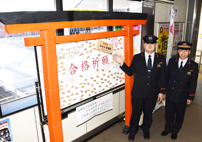東武東上線の坂戸駅、合格願う鳥居が登場 行先は「志望校」、切符模したカードで駅員ら受験生にエール