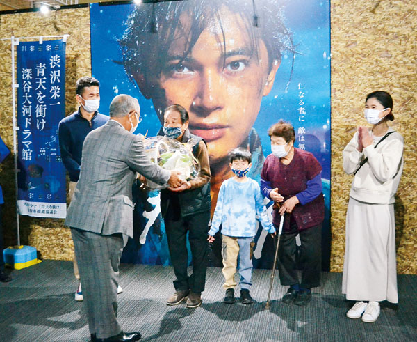 深谷大河ドラマ館、来館者1万人を達成 1万人目の家族に「ねぎ束」入り特産品 1日平均500人来場