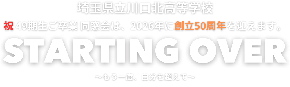 来る2026年、埼玉県立川口北高等学校同窓会は創立50周年を迎えます。これまでの50年に感謝しつつ、次の50年に向けて新たな一歩を踏み出します。つきましては、2026年5月に創立50周年記念式典の開催を企画しております。開催に向け、皆様のご意見をお聞きしたく存じますので、式典に関するアンケートへのご協力をお願いいたします。