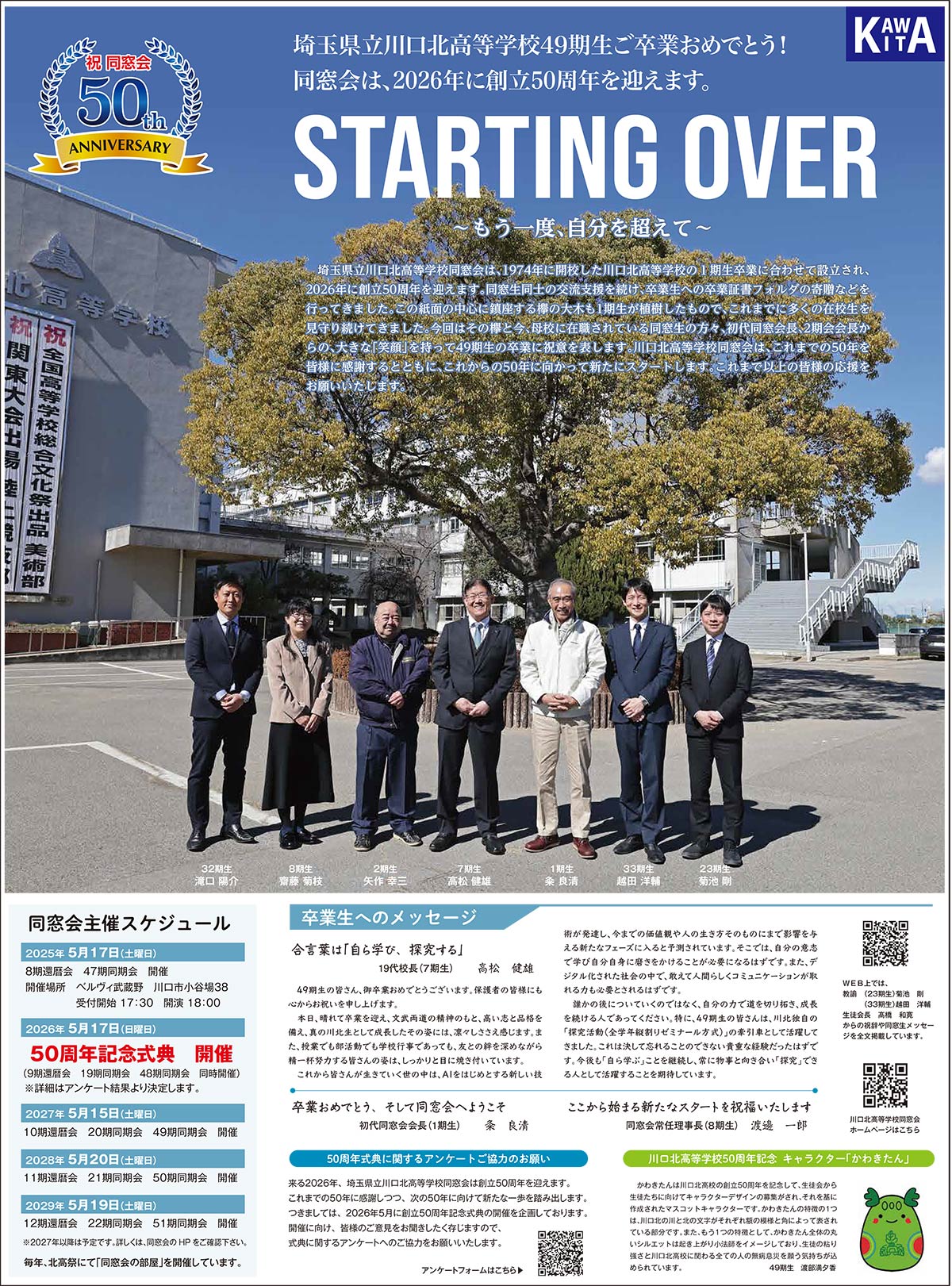 2026年、川口北高等学校同窓会は50周年を迎えます。今回の新聞広告は、母校に在職している同窓生の方々、埼玉新聞社様のご助力を仰ぎ作成しました。新しい同窓会の挑戦でもあります。より良い同窓会を作り上げるためにも、皆様のご協力をお願いいたします。
