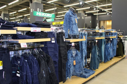 老舗の鳶衣料ブランド「寅壱」をはじめ、有名メーカーの商品を豊富に取り揃えました。売場では商品同士の間隔を十分に確保し、素材や機能を比較しながら選びやすい環境を整えています。