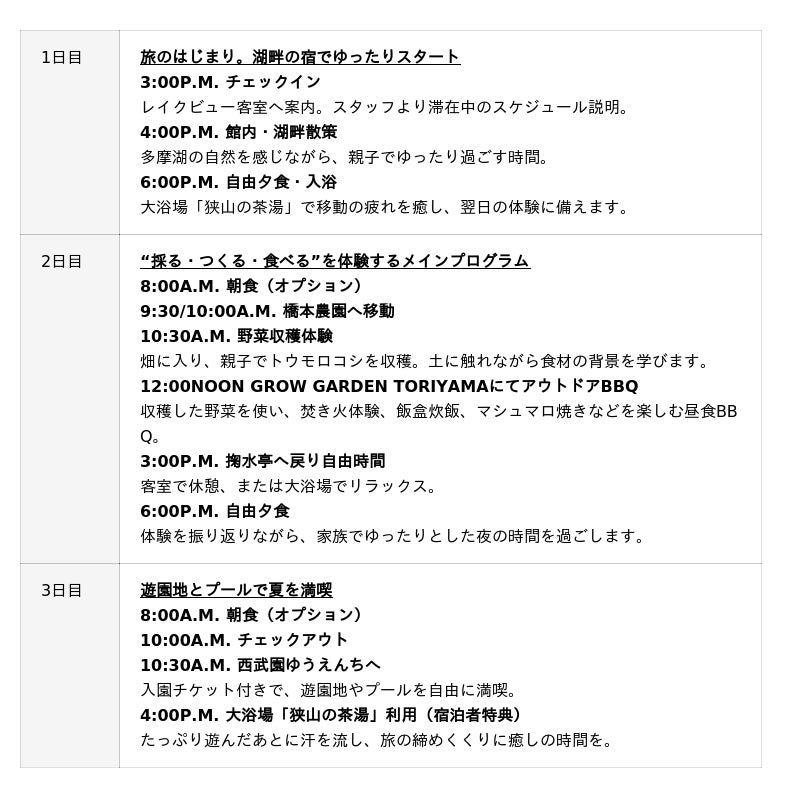 夏休みの家族旅行で「子どもに普段できない体験をさせたい」「遊びだけでなく学びのある時間を過ごしたい」といった声が高まるなか、本プランでは、遊園地やプールといった夏の定番レジャーに、トウモロコシ収穫やアウトドアBBQ などの食育・自然体験を組み合わせた、体験重視の2泊3日ステイをご用意いたしました。