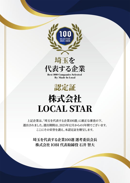 サステナビリティコンサルティングサービス『LOCAL STAR』を主に事業展開する株式会社LOCAL STAR(本社:埼玉県さいたま市大宮区、代表取締役 佐野正佳)は、2025年12月1日に、地方創生メディア「Made In Local」が選定する「地域を代表する企業100選」にて、埼玉エリアの企業100選に選出されましたことをお知らせします。
