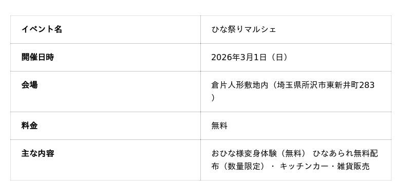 このほか、ひなあられの無料配布(数量限定)や、キッチンカーによるグルメ・雑貨販売もお楽しみいただけます。