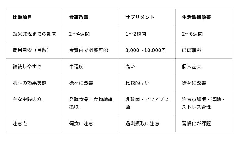 肌荒れやニキビが長期間続く場合は、スキンケアだけでなく腸内環境の改善を視野に入れた総合的なアプローチが効果的です。改善が見られない場合は、皮膚科専門の医療機関を受診することをお勧めします。