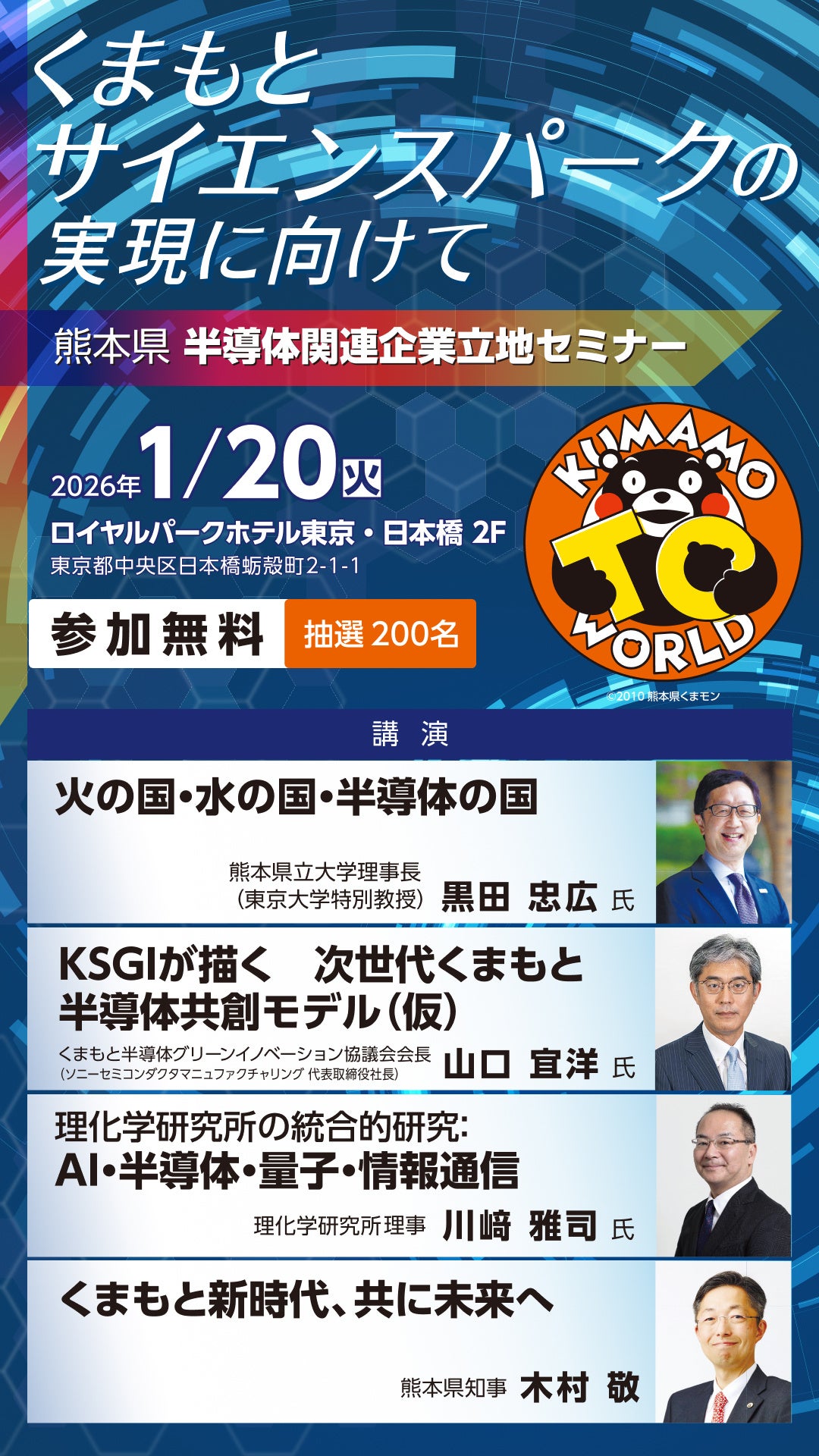 今、注目の「熊本県 半導体関連企業立地セミナー」 ~くまもとサイエンスパークの実現に向けて~ 1月20日(東京開催決定!)参加者募集!!