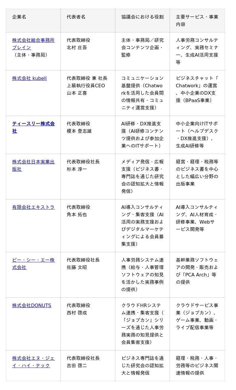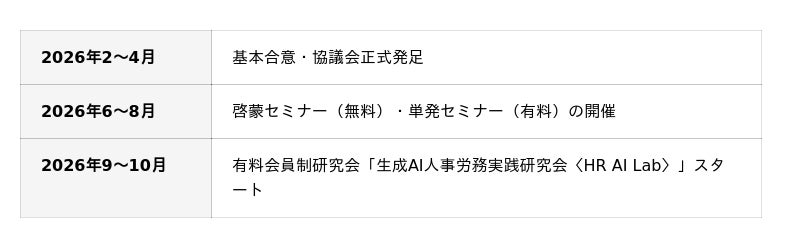 本協議会は、こうした課題に対し、企業と専門家が連携する共同プロジェクトとして、2026年10月発足予定の有料会員制研究会「生成AI人事労務実践研究会〈HR AI Lab〉」の実現を見据え、その準備・推進を行う協議体として設立されました。