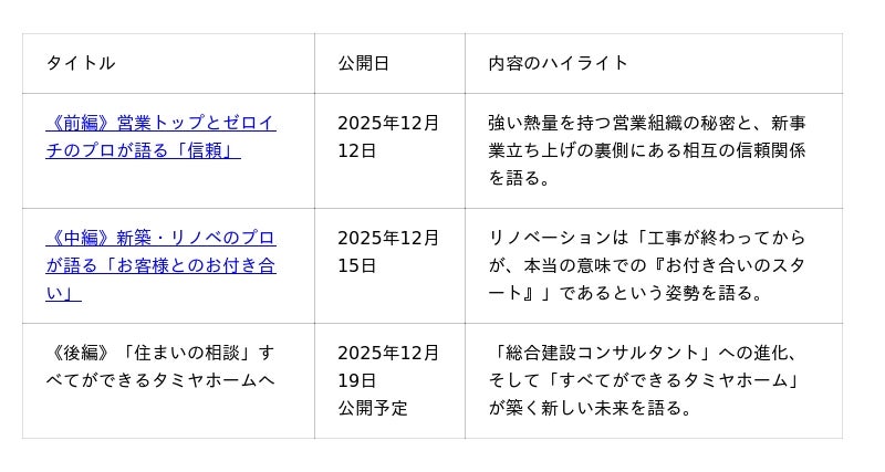 「かいたいが みらいを かがやかせる」を合言葉に一都三県を中心に解体工事業を展開する株式会社タミヤホーム(本社:埼玉県所沢市、営業本部:東京都千代田区永田町、代表取締役社長:田宮 明彦)は、2025年11月1日より本格始動した「リノベーション事業」について、この度、専用Webページを開設し、あわせて経営層および営業部門による対談記事を複数公開しましたことをお知らせいたします。