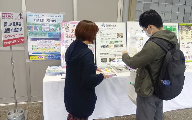 会場では、岡山大学R&D Showcaseのポスターや産学連携パンフレット等の資料を設置するとともに、産学連携コーディネーターや事務職員が展示スペースに常駐し、来場された企業・自治体・支援機関の皆さまに対して、岡山大学R&D ShowcaseやOI-Start、本学の産学連携の仕組み、共同研究、技術相談の流れなどについて説明しました。