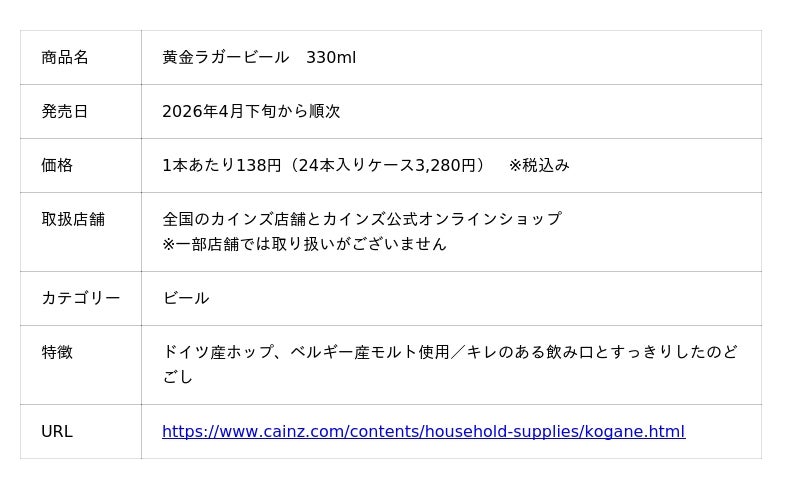 株式会社カインズ(本部:埼玉県本庄市、代表取締役社長 CEO:高家 正行)は、オリジナル商品「黄金(こがね)」シリーズ初となるビール「黄金ラガービール」を、2026年4月下旬から全国のカインズ店舗とオンラインショップで順次販売開始します。