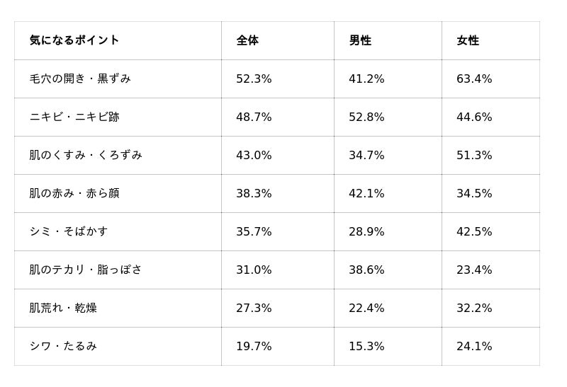 その結果、「毛穴の開き・黒ずみ」が52.3%で最も多く、次いで「ニキビ・ニキビ跡」(48.7%)、「肌のくすみ・くろずみ」(43.0%)という結果になりました。