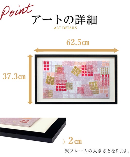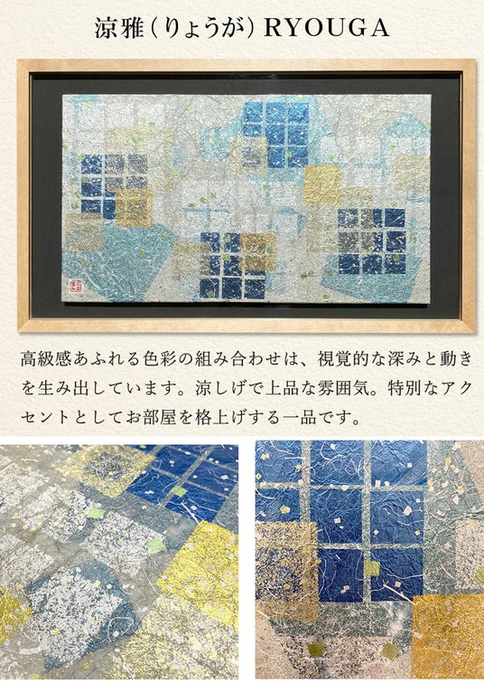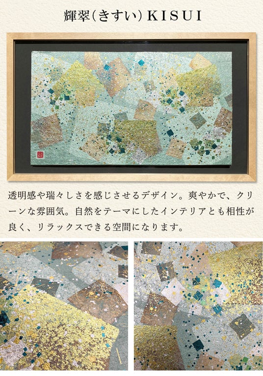 古典的な技法に加え、現代的かつ斬新なオリジナルの技法(企業秘密)は、日々切磋琢磨した逸材のみが成しえる技。古くは平安時代の王朝文化から受け継がれる優雅で華麗な素材と技を現代のモダンな造形感覚でアートパネルに表現しています。