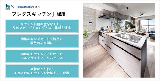 本物件では2LDK 73.11平方メートル ~4LDK 100.64平方メートル まで全10タイプのプランバリエーションをご用意し、玄関横には宅配業者が伝票番号を解除キーとして荷物を届ける「DELI BOX SMART」を全住戸に採用しております。専有部では、長谷工アーベストの女性スタッフを中心に「あったらいいな」をカタチにしたオリジナル仕様「U‘S Style(ユーズスタイル)」から、「スマートランドリー」、「カウンター付きペーパーホルダー」等を採用しました。キッチンには長谷工コーポレーションとタカラスタンダードが共同開発した新発想の「フレタスキッチン」を設置しました。また、シューズインクロゼット(SIC)から直接洗面室に行けるSICダイレクト洗面室プランや家族の動線に配慮した洗面・脱衣室分離プラン、アウトドア用品を置ける土間プラン、キッチンスペースを広く確保したキッチンアトリエプランなど個性豊かな間取りプランをご用意しました。