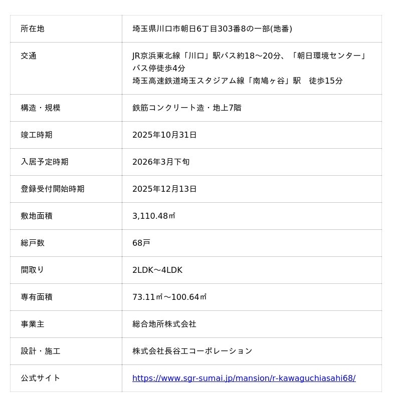 本物件は、埼玉高速鉄道埼玉スタジアム線「南鳩ヶ谷」駅徒歩15分、JR京浜東北線「川口」駅バス約18~20分、「朝日環境センター」バス停徒歩4分の立地に誕生する総戸数68戸のレジデンスです。間取りは、2LDK~4LDK、専有面積73.11平方メートル ~100.64平方メートル の全10タイプで、お客様のライフスタイルに応える商品として土間プランや洗面・脱衣室分離プラン、キッチンアトリエプランなど多彩なプランをご用意しました。さらに、全住戸に長谷工グループが独自開発した可動収納ユニット「UGOCLO(ウゴクロ)」を採用するとともに、玄関横には宅配業者が伝票番号を解除キーとして荷物を届ける新型宅配ボックス「DELI BOX SMART(デリボックススマート)」を初導入しました。環境への取り組みとして、環境配慮型コンクリート「H-BAコンクリート」を採用し、「ZEH-M Oriented」認証を取得しています。さらに理事会を設置しない新たなマンション管理サービス「smooth-e(スムージー)」を採用し、居住者の負担を軽減します。