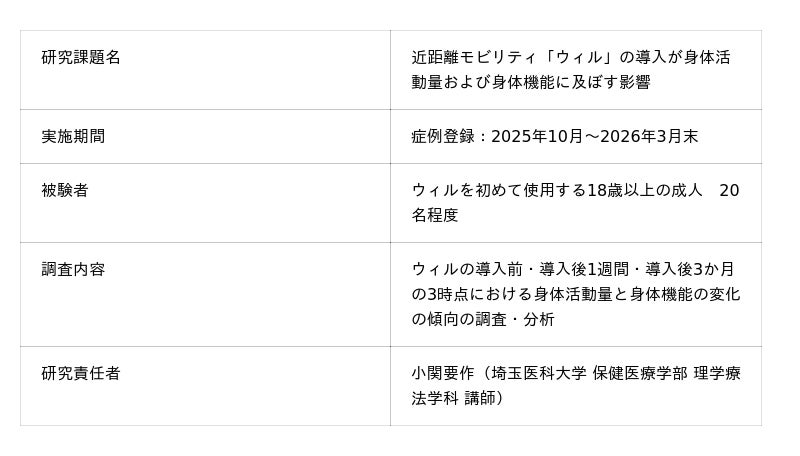 本研究は、ウィルの導入前後における身体活動量と身体機能の変化の傾向を調査・分析し、近距離モビリティがシニアの日常活動や身体機能に与える影響を定量的に把握することを目的とします。