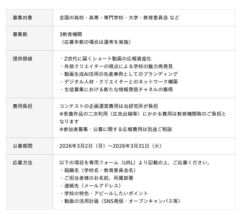 本企画は、教育機関が学校の魅力素材を提供し、全国の次世代クリエイターが動画生成AIを活用してプロモーション動画を制作する「共創型コンテスト」です。学生に限らず、社会人クリエイター・フリーランス・AI動画制作者など、動画AIに関心を持つあらゆるクリエイターが参加できます。学校関係者とは異なる外部の視点だからこそ見える「学校の魅力の再発見」を、15~60秒のショート動画として形にします。