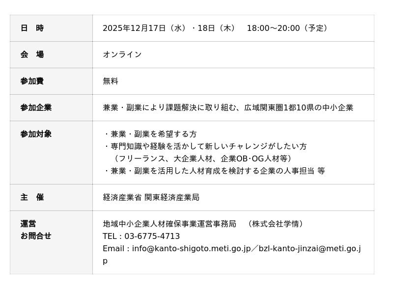 株式会社学情(本社:東京都中央区)は、経済産業省関東経済産業局より受託している「地域中小企業人材確保支援等調査・分析」の一環として2025年12月17日(水)18日(木)に「兼業・副業」を希望する方のためのオンラインマッチングイベントを開催します。