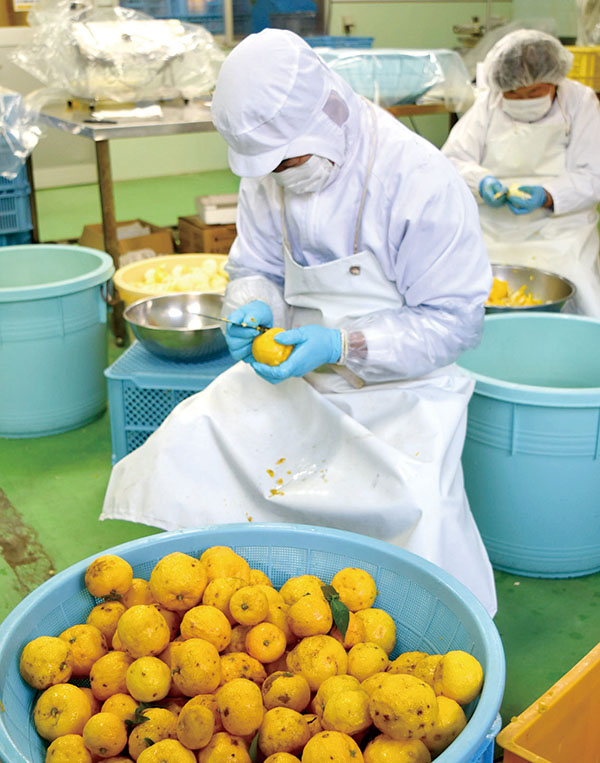 秩父産のユズでユズこしょう製造 秩父・吉田でユズの皮むき、さわやかな香りに包まれ作業進む
