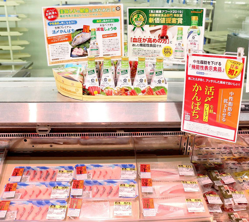ベイシア、おいしさと健康志向の両面PR 家飲み増え、中性脂肪下げるカンパチと減塩しょうゆを一緒に販売