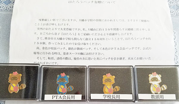 匿名寄付に感謝、熊谷・大幡小にバッジ750個届く 大幡小キャラのデザイン 送り主はキャラの親を名乗る