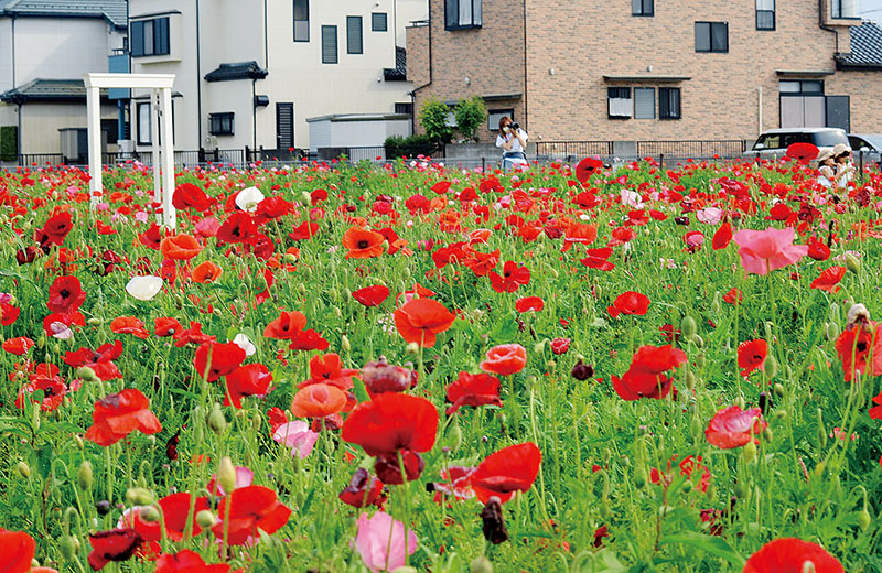 水辺のポピー見頃 願い込めフォトスポット「希望の扉」も 久喜の葛西用水路沿い、来週いっぱいまで