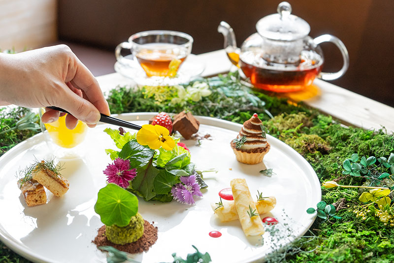 “食べるフラワーガーデン”、埼玉・熊谷の「おふろcafe」で開催 摘んだ花とスイーツで癒やし