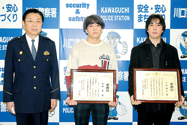 午後11時、冬の川に転落した男性が…幼なじみの学生2人、岸まで引き上げ救助 川口署が感謝状