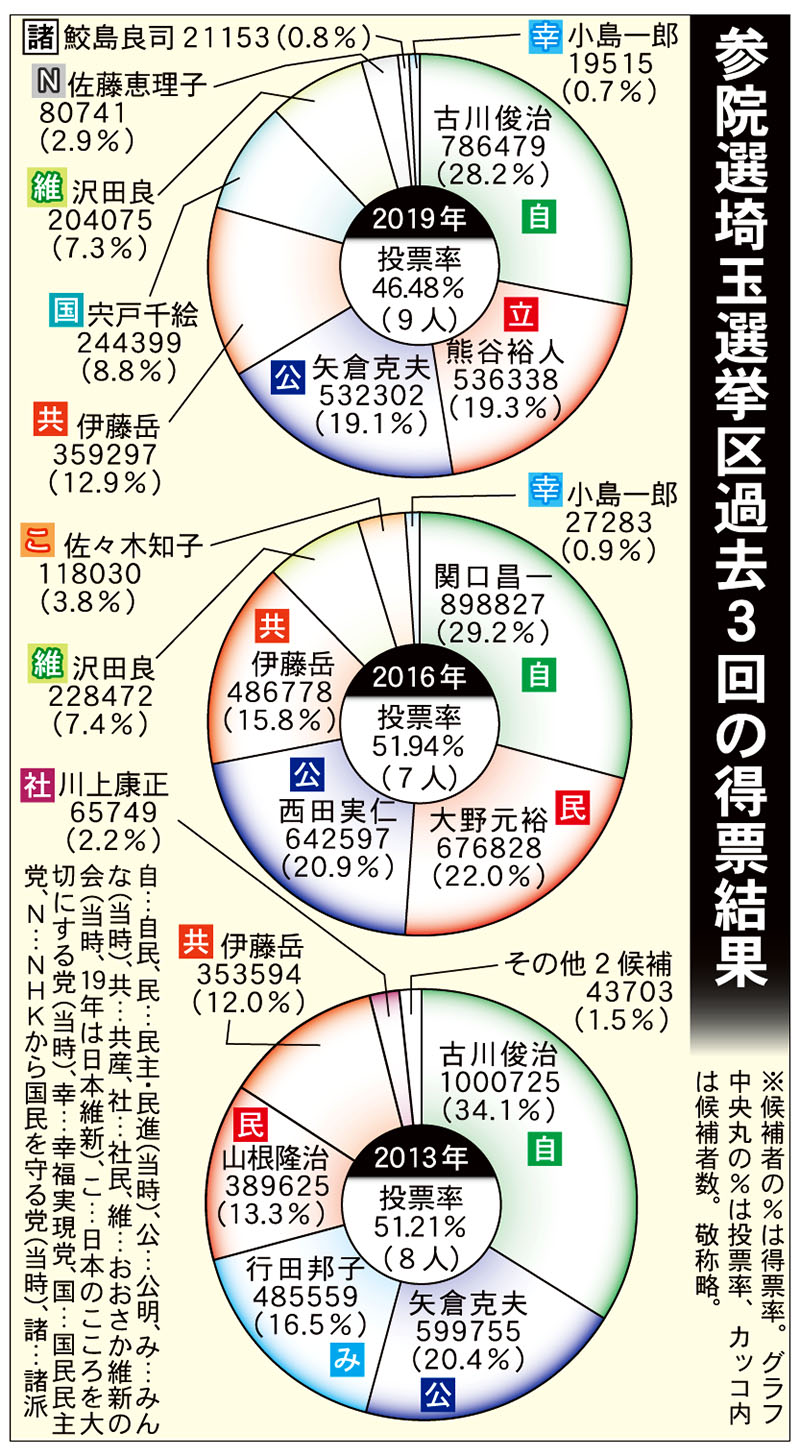 <参院選>埼玉選挙区、現職3氏軸に混戦か 与党が過半数維持か、野党が阻止するか 野党共闘の成否も注目