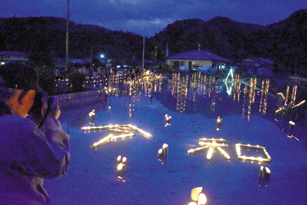 「令和」デザインした竹あかりも登場 小鹿野の田んぼでイベント、竹に穴開け明かりともす